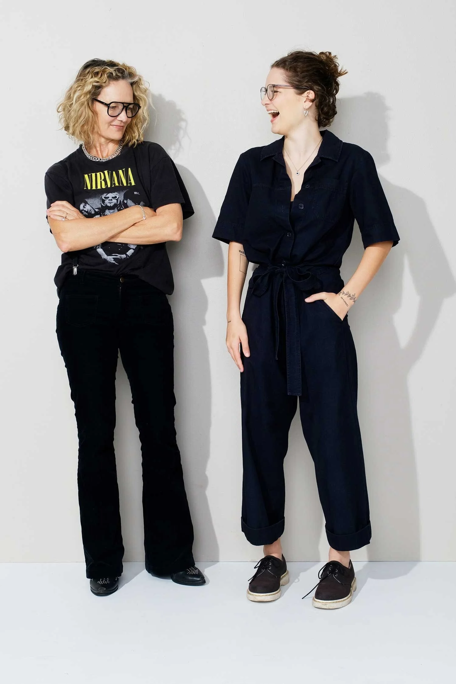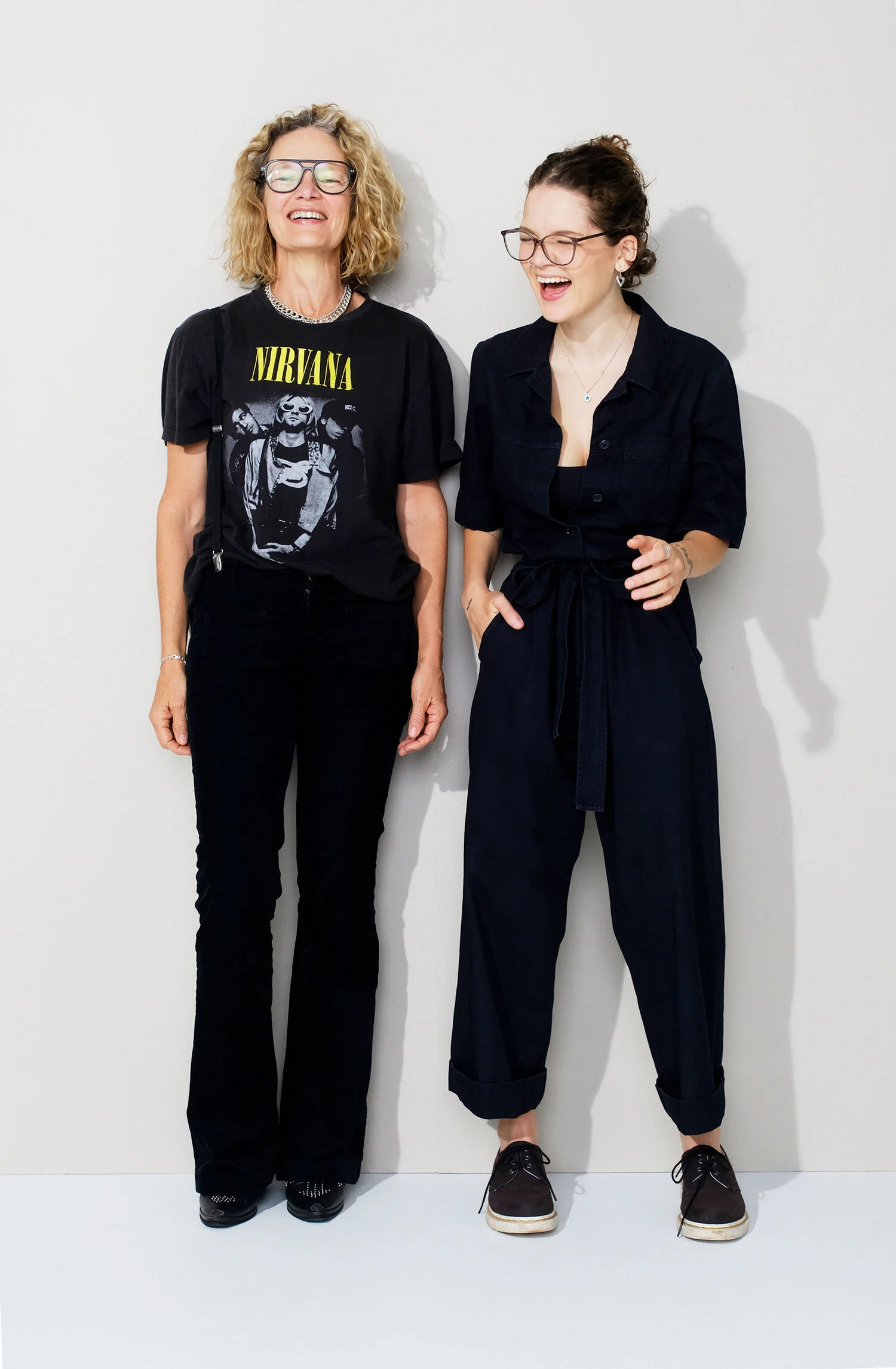 T We may not be the same size but we do have the same style, so we had fun choosing outfits for each other. This jumpsuit she’s wearing I wore a lot in my 20s; the roller skates I’m wearing came from the same era.